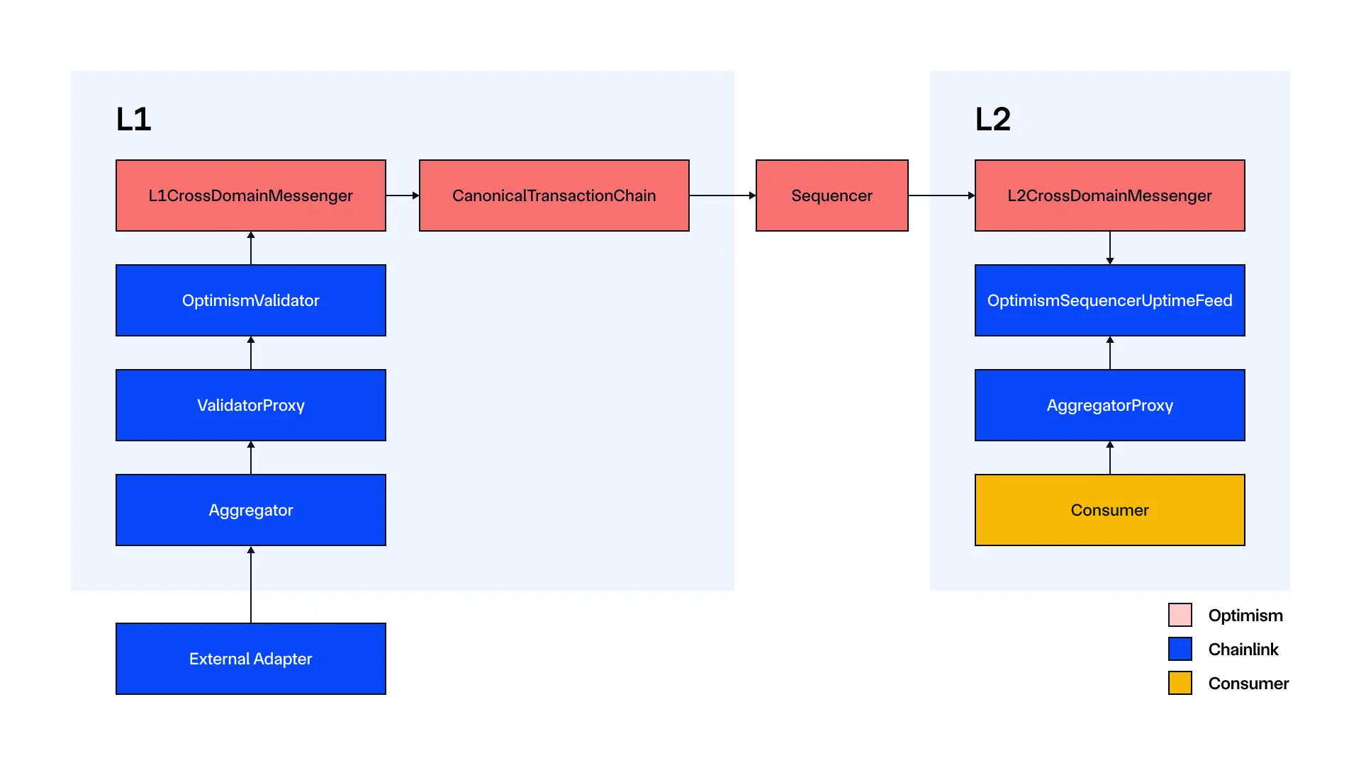 2. The L2CrossDomainMessenger contract relays the message to the OptimismSequencerUptimeFeed contract.